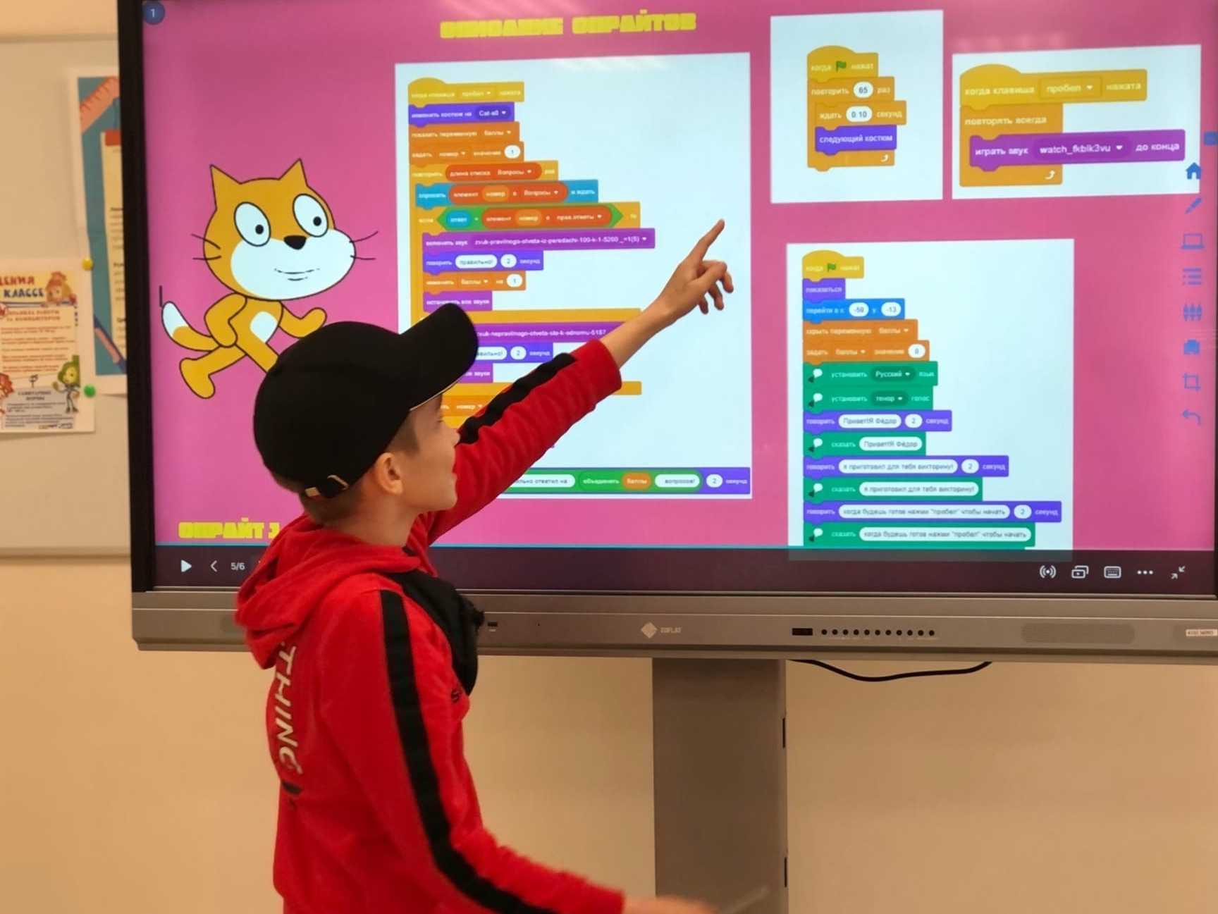 В рамках курса обучающиеся знакомятся с основами алгоритмизации, создают полноценные анимированные сюжеты, мультфильмы, а также разрабатывают собственные игры (бесконечные, кликеры, платформеры) и обучающие приложения (калькулятор, переводчик и т.д.) на языке программирования Scratch.
