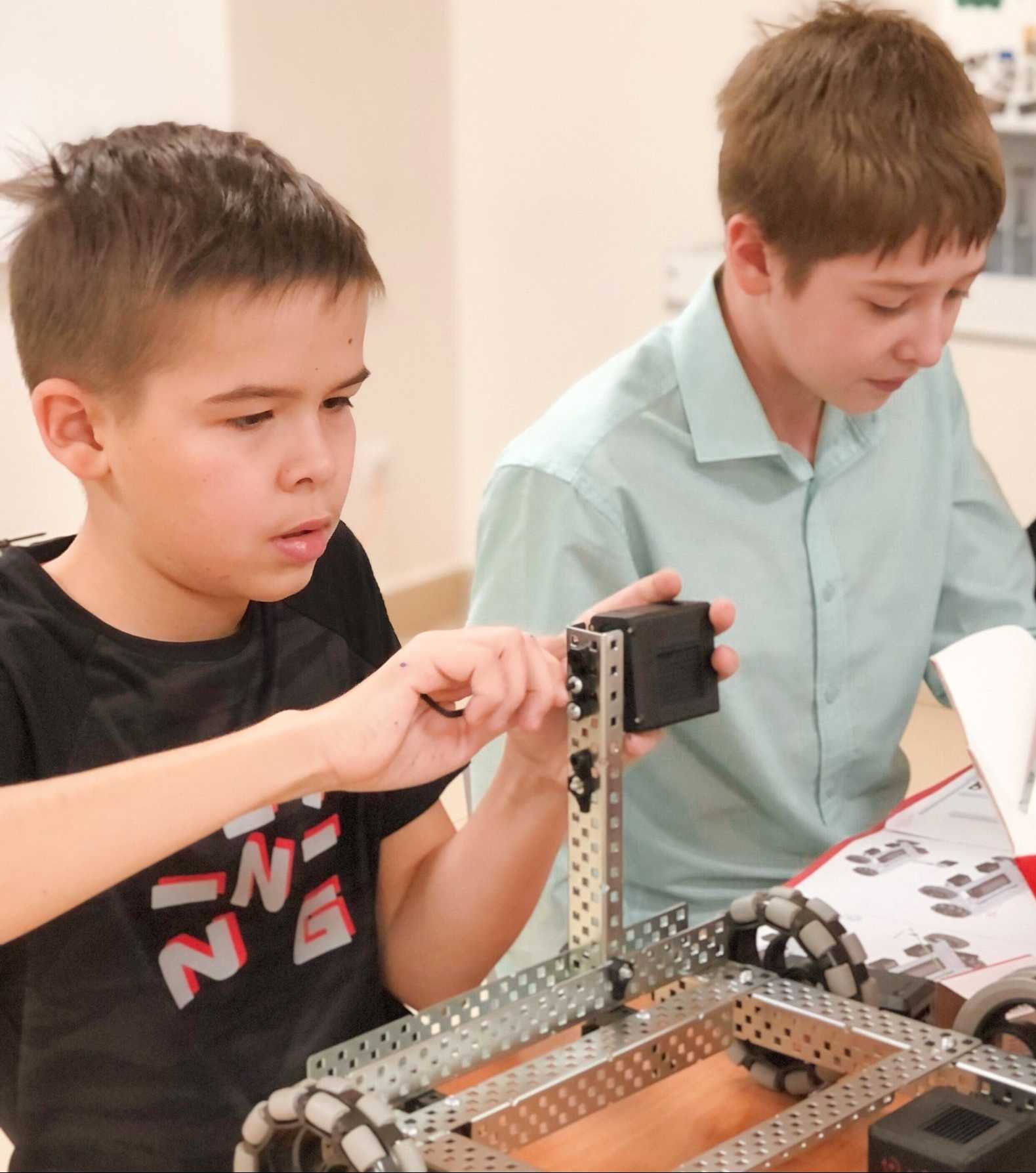 «Программирование роботов», которое, в свою очередь, подразделяется на несколько групп для разных возрастных категорий: группа 7-9 лет, группа 10-14 лет. На данном курсе дети изучают основы робототехники с использованием робототехнических конструкторов "VexIQ". Сначала дети изучают виртуального робота в среде VEX VR, учатся им управлять, понимать габариты и скорость, далее, сдают экзамен и переходят к сборке первого физического робота из конструктора (сборка происходит в мини-группах до 5 человек), затем учатся управлять им с помощью джойстика, после чего переходят к изучению программирования физического робота с помощью программного кода. В течение года собирают еще несколько конфигураций роботов, участвуют в конкурсах и соревнованиях.